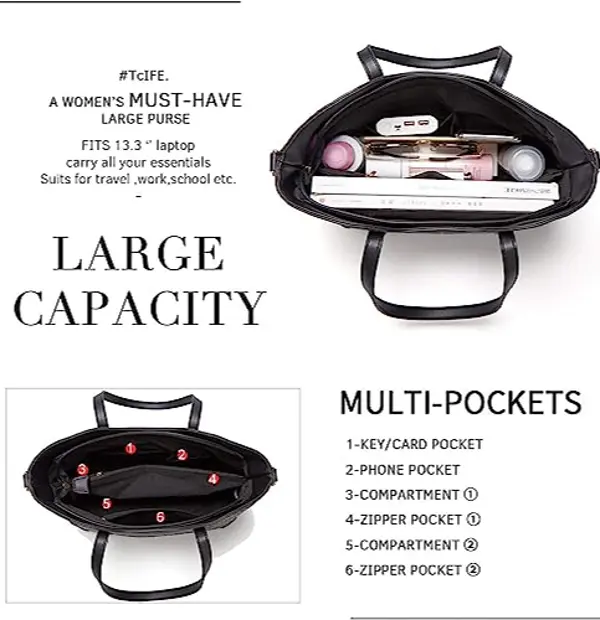 - Diffrent Ways to Carry: Leather Tote---You can use this as large tote bag to carry your stuffs when you going out; Shoulder Purse---It contains one adjuatble shoulder strap so you can carry it a shoulder bag as well;Crossbody Purses for women---you can carry it as a cross body purse when your hands are not free(like when you are carrying your baby/kids); Book Bag/Laptop Bag---It is just perfect size, it can fit 11 InchMac and ipad very well