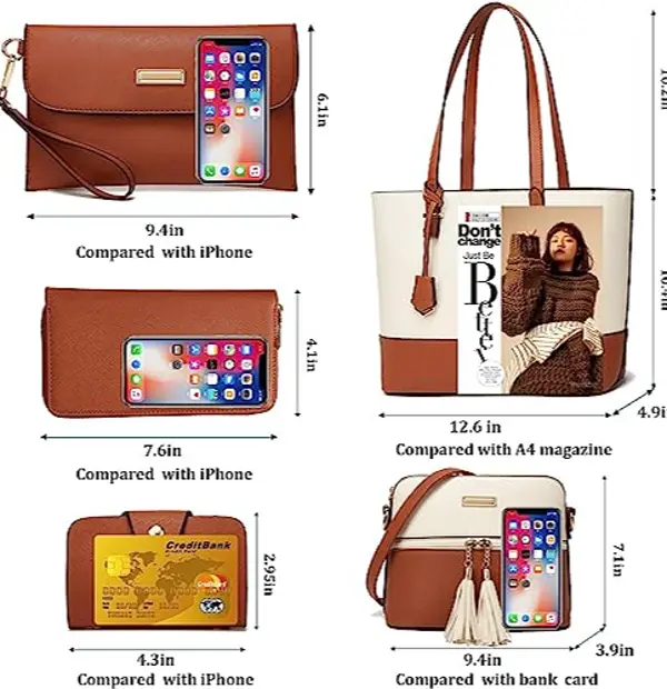 - Dimension:Handbag:12.6x10.6x4 inch(W*H*D). Messenger bag:10.2x7.3x4inch(W*H*D),long shoulder strap length:43.3inch. Wallet clutch:9.7x6.3inch(W*H). Total weight: About 0.85kg/1.9pound. Please refer to the size before you purchasing. Thanks for your kindly understanding.Handbags for Women