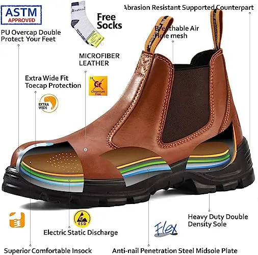 ?【SUPERIOR COMFORTABLE】: These chelsea work boots offer thickness and soft shock absorption foam memory insoles,breathable air hole mesh keep your feet dry and anti-fatigue on hot days, fiber structures provide nice and warm on cold days. Repeated Impact Protection, Comfort, Breathable, Thin and Lightweight, Endurance.